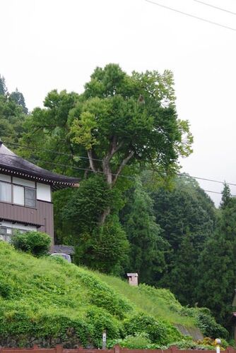 雪森地区は、妙高市役所の北北西約4kmのところ 県道63号上越新井線を北へ国道18号線の乙吉信号を過ぎると雪森地区です 左手の妙高市立斐太北保育園先の交差点(信号機無し)を左へ 雪森橋で川を渡った先の集落の中、右手の石垣の上の太い幹のケヤキが…